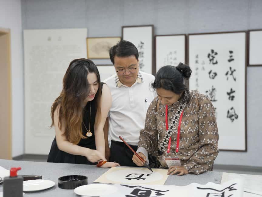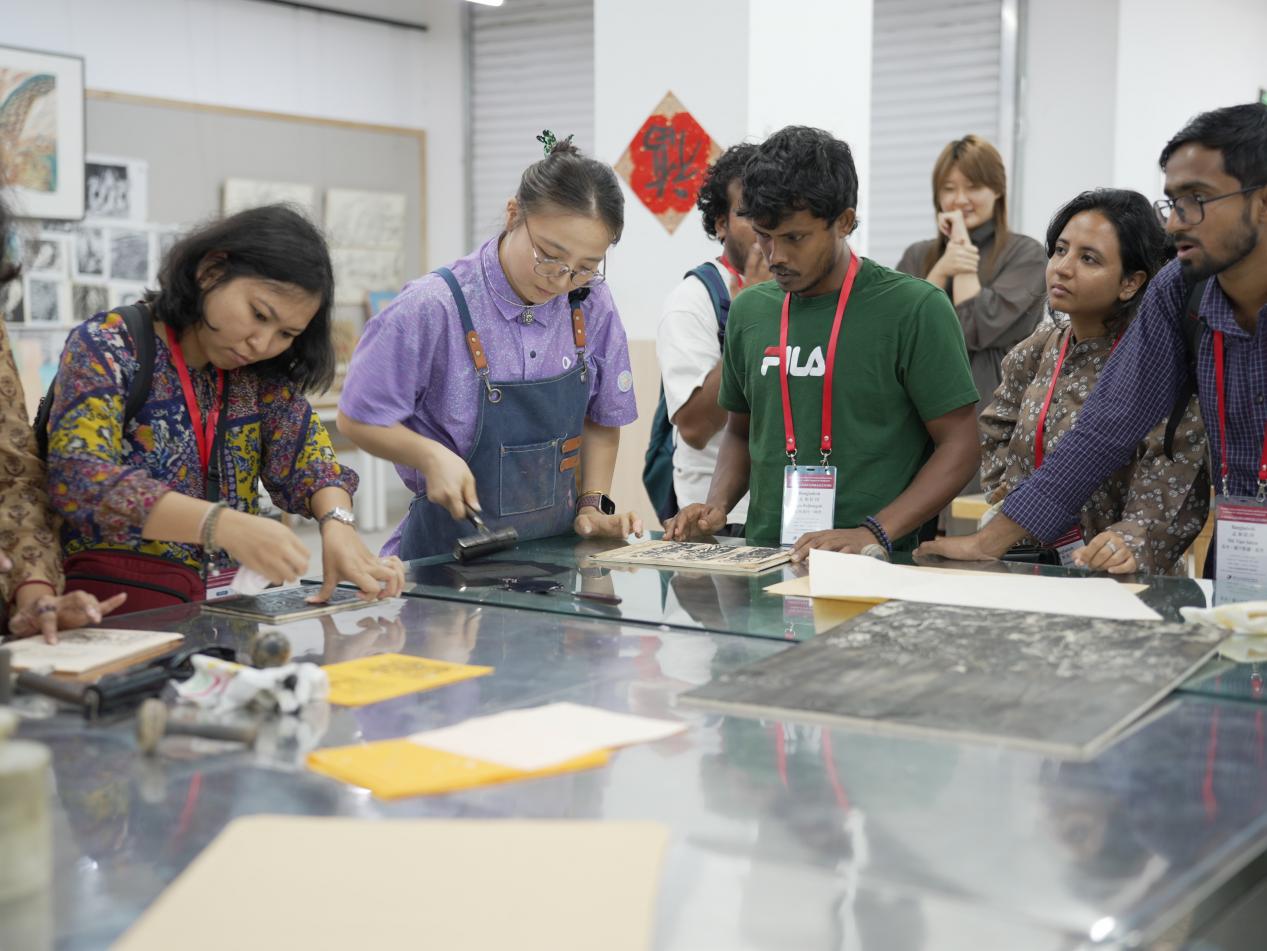 代表团成员们也积极参与体验,亲手尝试了版画制作、中国画绘制和书法创作,切身感受了中国传统艺术的深厚底蕴。在参观过程中,代表团成员深入了解了安徽艺术学院在传统艺术传承与创新方面的成果,并对学院在专业建设、艺术教育方面取得的成就表示赞赏。