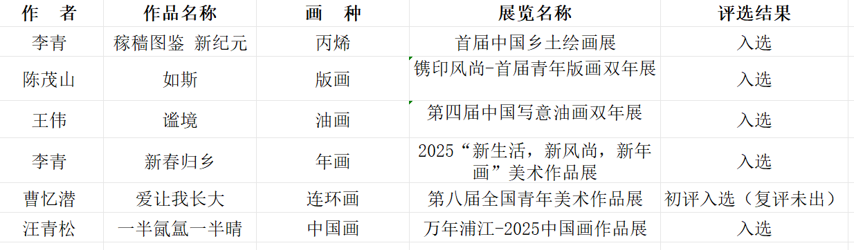 截至今日,美术学院在2025年共有六件作品成功入选国家级美术展览,涵盖中国画、油画、版画、年画、连环画等多个画种,实现了学院在国家级展览入选数量与质量上的历史性突破。