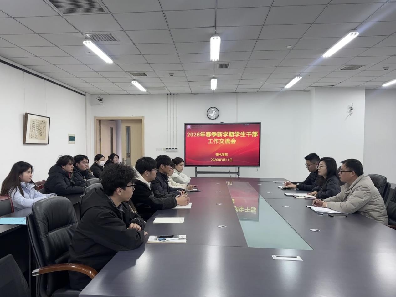 为进一步加强学生干部队伍建设,凝聚学生工作合力,精准掌握学生新学期发展需求,3月11日下午,美术学院在307会议室召开2026年春季新学期学生干部工作交流会。学管办主任刘民主持会议,学院副书记陈伟伟、院团总支书记、学生支部书记及主要学生干部参会。