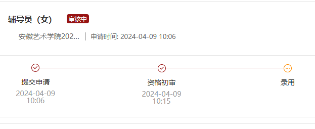我校2024年公开招聘人员初审结果已开通查询,请报名考生登录安徽艺术学院2024年公开招聘人员公告“我的申请”中进行查询。如下图即为初审通过: