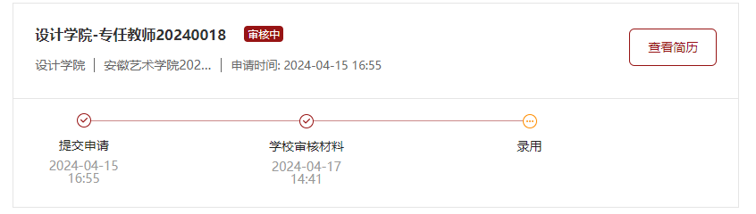 我校2024年公开招聘人员(二)初审结果已开通查询,请报名考生登录安徽艺术学院2024年公开招聘人员公告(二)“我的申请”中进行查询。如下图即为初审通过: