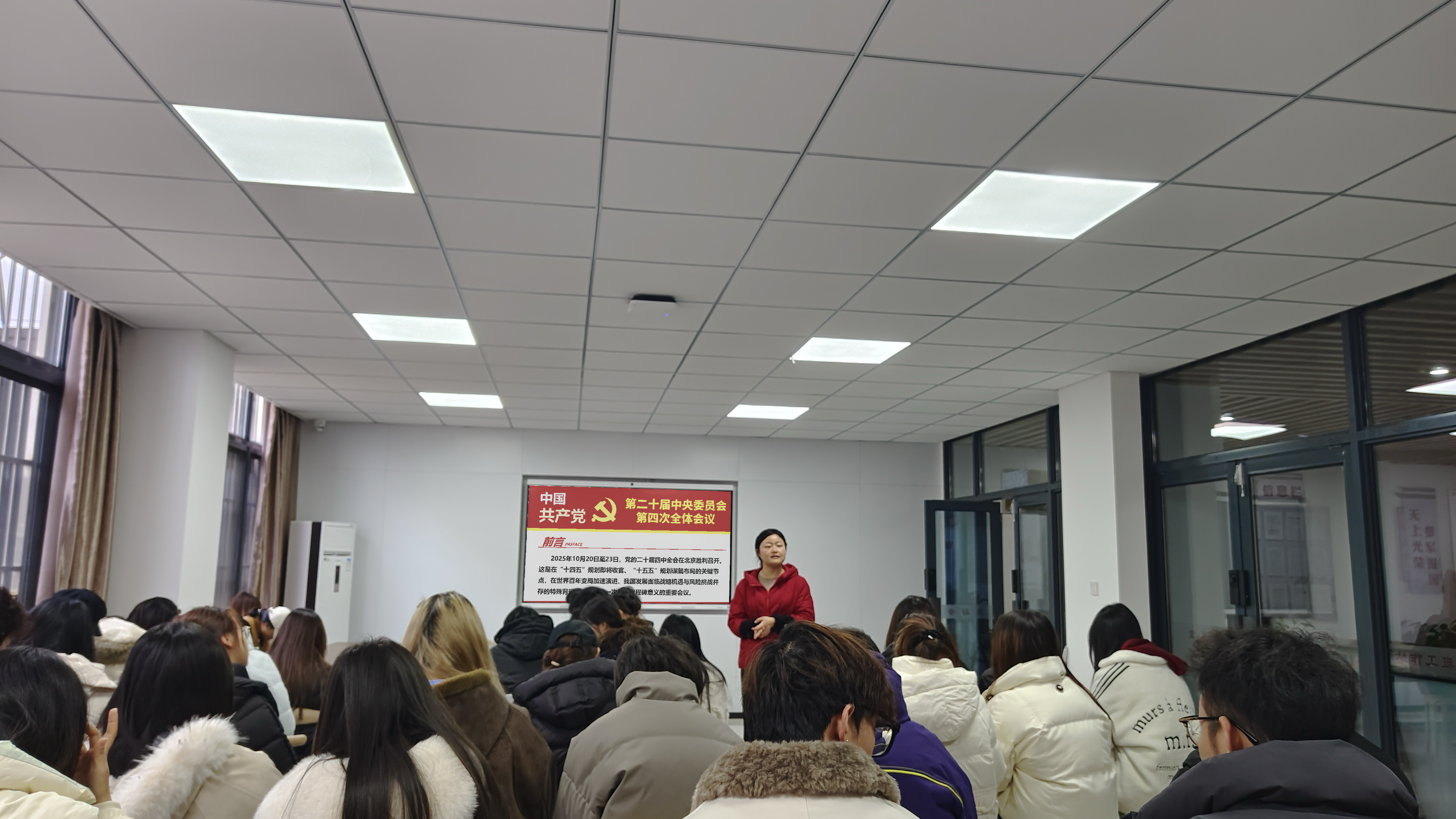 为深入学习贯彻党的二十届四中全会精神,系统总结本学期班级工作成果与经验,凝聚集体共识与未来合力,12月22日,2024级视觉传达设计专业在学生一站式社区组织召开了党的二十届四中全会精神宣讲暨班委期末总结会。本次会议将全会精神宣讲与班委期末总结会有机结合,由辅导员方文霞老师主持并主讲,全体班委共同参加。会议伊始,会议伊始,辅导员方文霞围绕党的二十届四中全会精神,结合视觉传达设计专业的学科特点与发展趋势,从专业创新、实践赋能、青年责任三个层面展开系统宣讲。她引导同学们深刻理解全会对新时代青年成长成才的期望与要求,激励大家在专业学习中厚植文化自信、在创作实践中回应时代需要,自觉将个人发展融入国家文化建设的进程中。随后进行班委期末工作总结环节。各班委实事求是总结成绩,客观分析工作中存在的不足,并广泛听取现场同学的意见建议,明确了下学期改进与努力的方向。本次会议有效实现了思想引领与班级建设的深度融合,既推动党的二十届四中全会精神入脑入心,也通过班委期末总结会议凝聚了班级共识、激发了集体活力,为视觉传达设计专业2024级同学今后的成长发展与班级建设奠定了扎实基础。撰稿:卢诗霖 摄影:李雯 编辑:薛