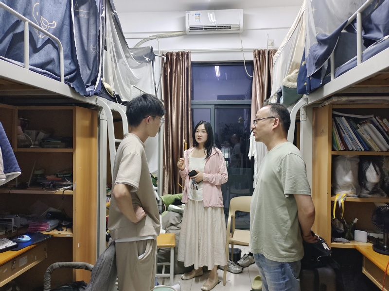 为进一步做好毕业生离校工作,站好最后一班岗,确保2025届毕业生安全、平稳、文明离校,6月18日晚上,设计学院党总支副书记夏守军带领毕业班辅导员郗文静、徐阳阳等深入走访毕业生宿舍。走访过程中,夏守军详细询问了同学们的毕业去向、就业进展、升学情况及未来发展规划,认真倾听了同学们大学四年的感悟与收获,对大家提出的问题和困惑给予了耐心细致的解答和指导,并就离校安全事项进行了重点叮嘱。他希望,毕业生们无论身在何处,都能铭记在设计学院的成长历程,常怀感恩之心,关注母校发展。此次宿舍走访活动体现了设计学院对毕业生的深切关爱和殷切期望,也进一步增强了师生之间的情谊。毕业生们纷纷表达了对老师、同学的不舍和对母校培养的感激之情。学院将持续以精细化服务护航毕业生离校“最后一公里”,让温暖与期许伴随每一位毕业生扬帆远航,奔赴美好未来。撰稿、摄影:徐阳阳,编辑:薛莲 复审:王从启 审定:俞璋凌