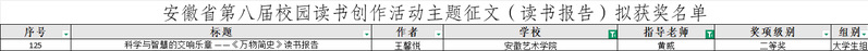 近日,由安徽省委教育工委、省教育厅、省人力资源和社会保障厅、省文化和旅游厅、省新闻出版局、团省委共同主办的安徽省第八届校园读书创作活动评选结果揭晓。设计学院2023级环境设计1班王馨悦同学凭借其作品《科学与智慧的交响乐章-万物简史读书报告》荣获二等奖,展现了设计学子扎实的人文素养与跨学科创新能力,为学院争得了荣誉。本次校园读书创作系列活动以“读书引领人生,创作点亮梦想”为主题,以多种形式深化全民阅读习惯,营造书香校园氛围,引导激励全校广大师生爱读书、读好书、善读书。近年来,设计学院高度重视“书香氛围”营造,积极鼓励、支持和引导学生多读书、读好书,鼓励学生立足专业、艺科融合,在传承与创新中彰显青年担当。未来,设计学院将继续以赛事为抓手,搭建多元实践平台,组织师生广泛开展阅读推广活动,精心组织主题创作活动,积极推动系列特色活动,助力学子在人文素养与专业能力的双重提升中成长成才。撰稿:黄威 图片:王馨悦 编辑:薛莲 复审:王从启 审定:俞璋凌