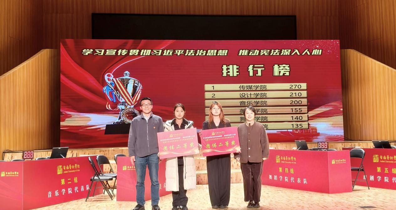 12月3日,安徽艺术学院第四届宪法知识竞赛圆满落幕。由桑程晨、高巧玲、朱雯雯和周笑笑四位同学组成的设计学院代表队凭借扎实的知识储备、默契的团队协作与沉着的临场表现,获得总分第二名的优异成绩,充分展现了设计学子良好的法治素养与综合能力。此次竞赛以“学习宪法知识,弘扬宪法精神”为主题,全面考验参赛选手的宪法知识功底与快速反应能力。为在竞赛中取得佳绩,设计学院高度重视,提前谋划部署。备赛期间,队员们合理分配时间,利用课余反复研读宪法条文、梳理知识框架,形成了互助共进的良好备赛氛围。竞赛现场,设计学院代表队沉着应战。必答题环节稳扎稳打,正确率100%;抢答题环节反应迅速,精准把握答题时机,果断抉择展现智慧。队员们配合默契、应答流畅,精彩表现赢得现场师生的阵阵掌声,最终在众多强队中崭露头角,以总分第二名的好成绩获得二等奖。此次获奖不仅是对参赛队员努力的肯定,更是设计学院加强法治教育的成果体现。设计学院将以此次竞赛为契机,持续推进宪法学习宣传教育,引导学生树立法治观念,让宪法精神融入校园生活的方方面面。撰稿:桑程晨 摄影:黄威 王明慧 编辑:薛莲 复审:王从启 审定:俞璋凌