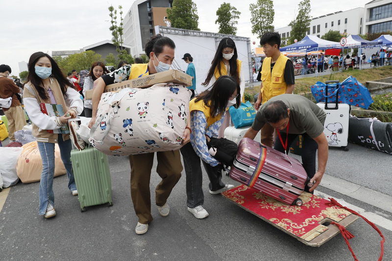 设计学院迎新志愿者分散在行李接运点、学院报到点、新生宿舍区等新生急切需要帮助的地方工作,他们身着黄色的志愿者马甲,为新生搬运行李,指引带路,协助办理各项手续,帮助新生解疑答惑。