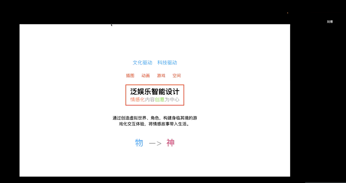 10月31日,刘博副教授做了题为《泛娱乐智能设计》专题讲座,刘教授从移动终端交互故事设计、游戏设计、辅助医疗的游戏化设计、儿童教育中的娱乐化设计、主题公园的娱乐设计、智能汽车的娱乐设计等方面做了详细介绍,并就其团队在设计创新和国内外竞赛参与等方面进行了经验分享。最后,刘教授还就设计创新与竞赛创作等方面与线上师生进行了交流。为师生在参加国内外有影响力的设计奖项方面提供了宝贵经验。