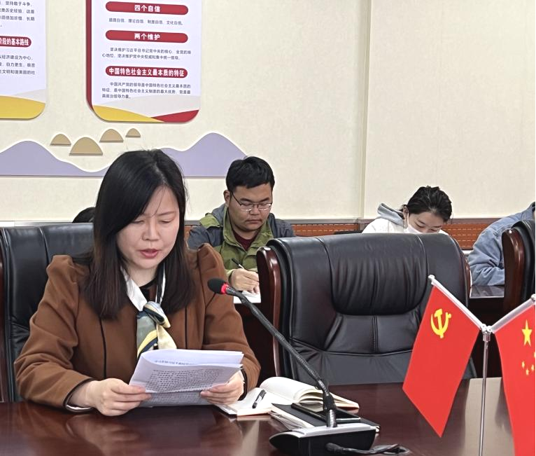 会上,参会人员集体观看了新闻联播《学习贯彻习近平新时代中国特色社会主义思想主题教育工作会议在京召开 习近平发表重要讲话强调 扎实抓好主题教育 为奋进新征程凝心聚力》的报道。之后,教师支部党员代表、安徽非遗艺术研究中心主任杨丽领学安徽省召开主题教育动员大会精神,传达了安徽省学习贯彻习近平新时代中国特色社会主义思想主题教育工作的总部署和总要求。