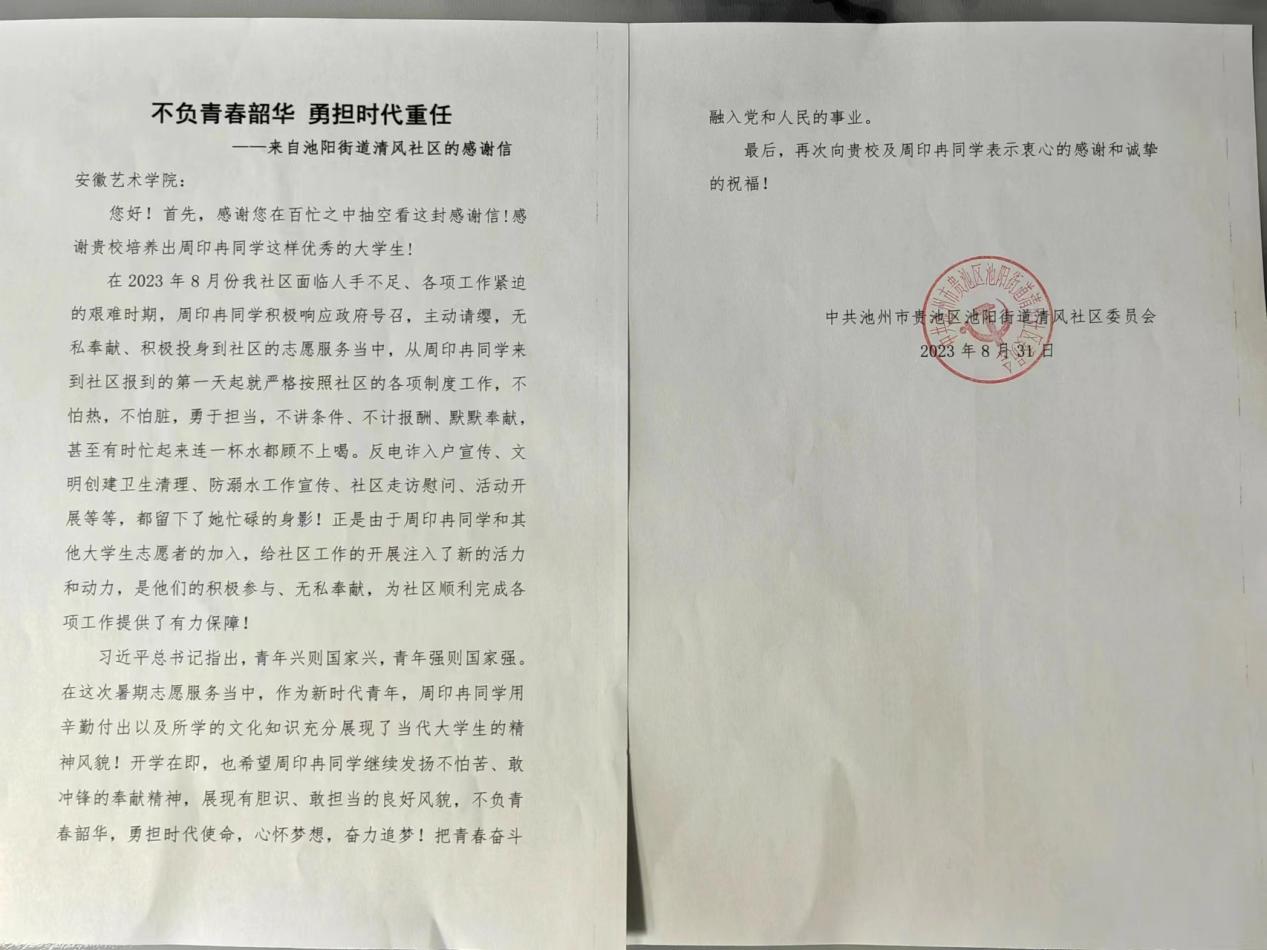近日,池州市贵池区池阳街道清风社区委员会向我校发来表扬信,对设计学院2022级视觉传达设计3班周印冉同学在志愿活动中的优秀表现给予赞扬。