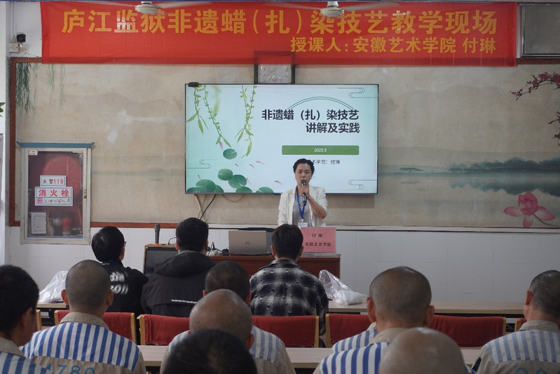 5月25日上午,安徽艺术学院设计学院非遗保护专业师生走进庐江监狱,参与“与爱同行 筑梦未来”监狱开放日活动,为服刑人员及其未成年子女带来了一场别开生面的非遗蜡(扎)染互动课。在高墙之内,传统技艺的绚烂色彩与亲情的温暖交织,为特殊家庭架起了一座文化传承与情感联结的桥梁。
