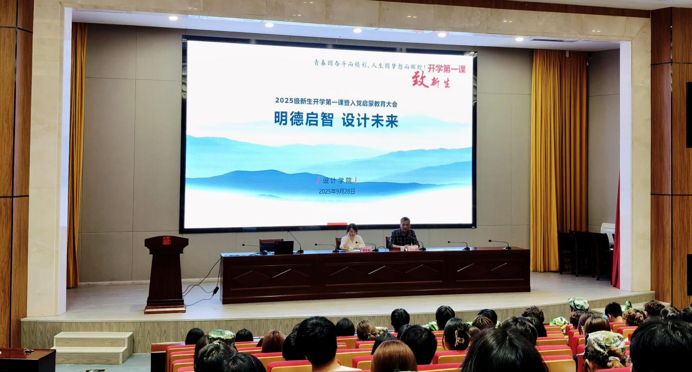 9月28日晚,设计学院 2025 级新生“开学第一课”暨入党启蒙教育大会在崇德楼5楼报告厅举行。设计学院党总支书记俞璋凌、副院长撒后余担任主讲,全体新生齐聚会场聆听授课。大会由学生党支部书记黄威主持。