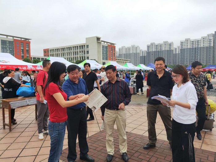 上午9点,学院党委书记、院长周之虎,副院长张晶来到各系部新生报到点,详细询问新生报名、住宿安排、学费缴纳以及后勤服务等工作落实情况,对现场人员的工作状态表示赞许,并希望他们以饱满的热情和细致周到的服务。在迎新现场,各系部迎新站点整齐有序,各类指示牌清晰醒目,使新生与家长清晰明确报到流程。现场的迎新工作人员热情地接待新生,耐心地为他们办理报到手续。热闹的校园里人来人往,迎新工作有条不紊地进行着。