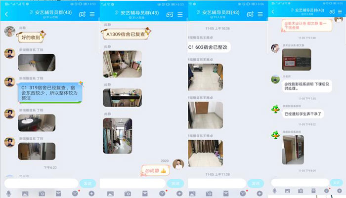 与此同时,学生处、总务处、团委设计工作方案,从给每一间宿舍挂铭牌开始,制定卫生标准、规范一系列要求、严格检查程序。一方面启动辅导员进宿舍签到制等,强化辅导员、学管老师在“宿舍革命”一线的作用发挥;另一方面学院每日值班学工老师和院系学生会联合检查宿舍的卫生、安全等情况,所有发现问题当天反馈,责任到人,群内及时公布复查情况。宿舍管理中的各项成绩也将和学生校内奖学金、国家奖学金和励志奖学金等评奖评优评先挂钩。从9月的“查寝”试运行,到10月的院与系、师与生联动,再到本月引入追踪反馈机制、确保发现的问题3天内有答复有整改,学生管理、学生服务与指导等工作在每一天深入宿舍、走进学生的过程中真正走完“最后一公里”。