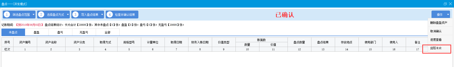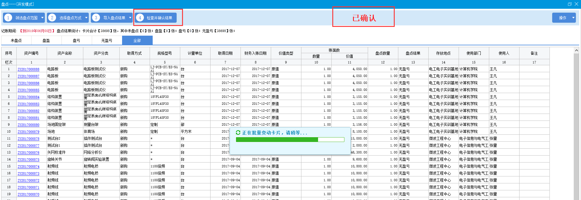 盘点结果确认,并反写部门、人员、存放地点等需要调整的数据,完成此次盘点
