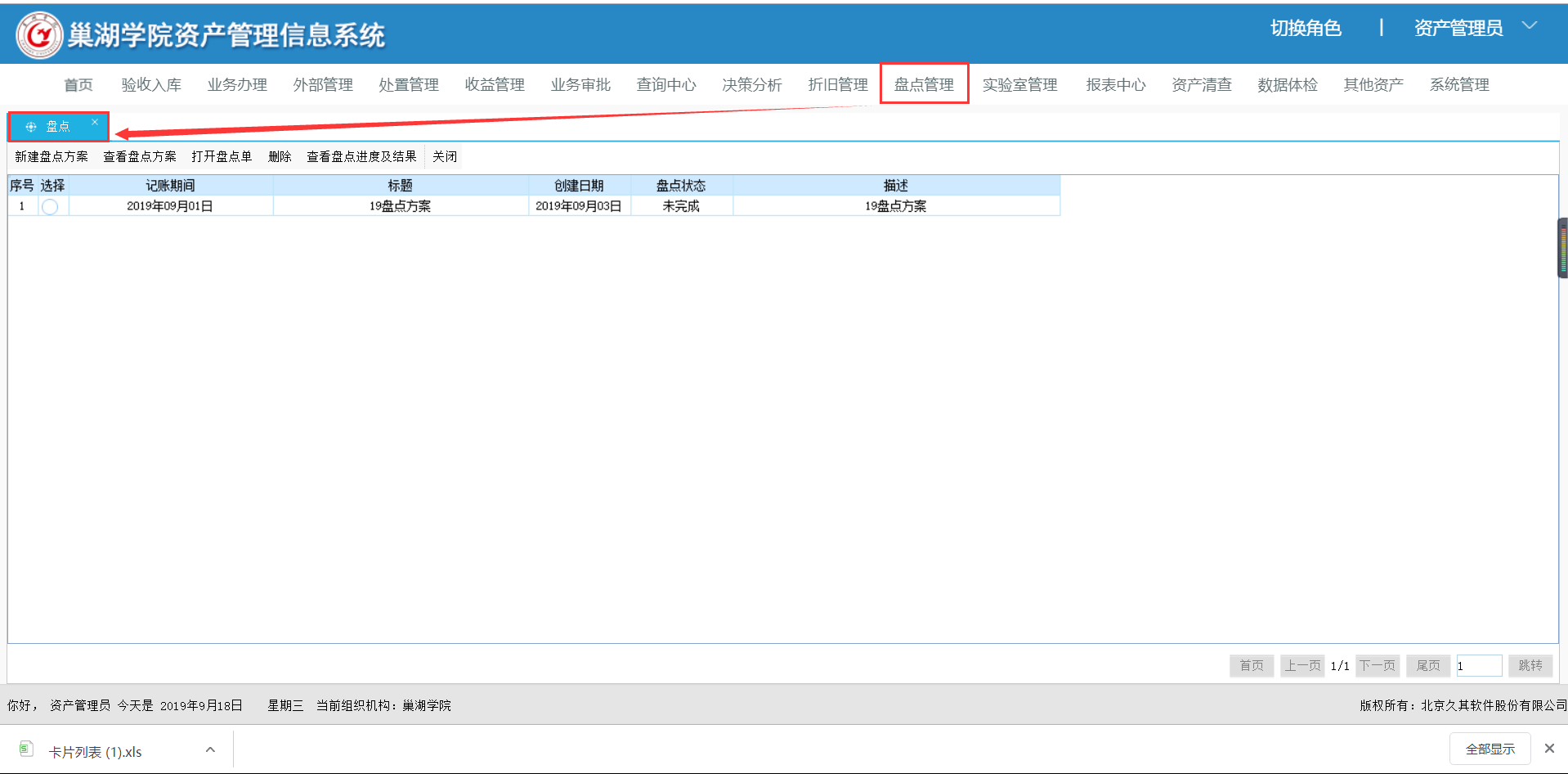 以【录入盘点信息】为例,录入盘点数量,如果部门、存放地点以及使用人需要调整的可以在盘点的表格中进行填写,