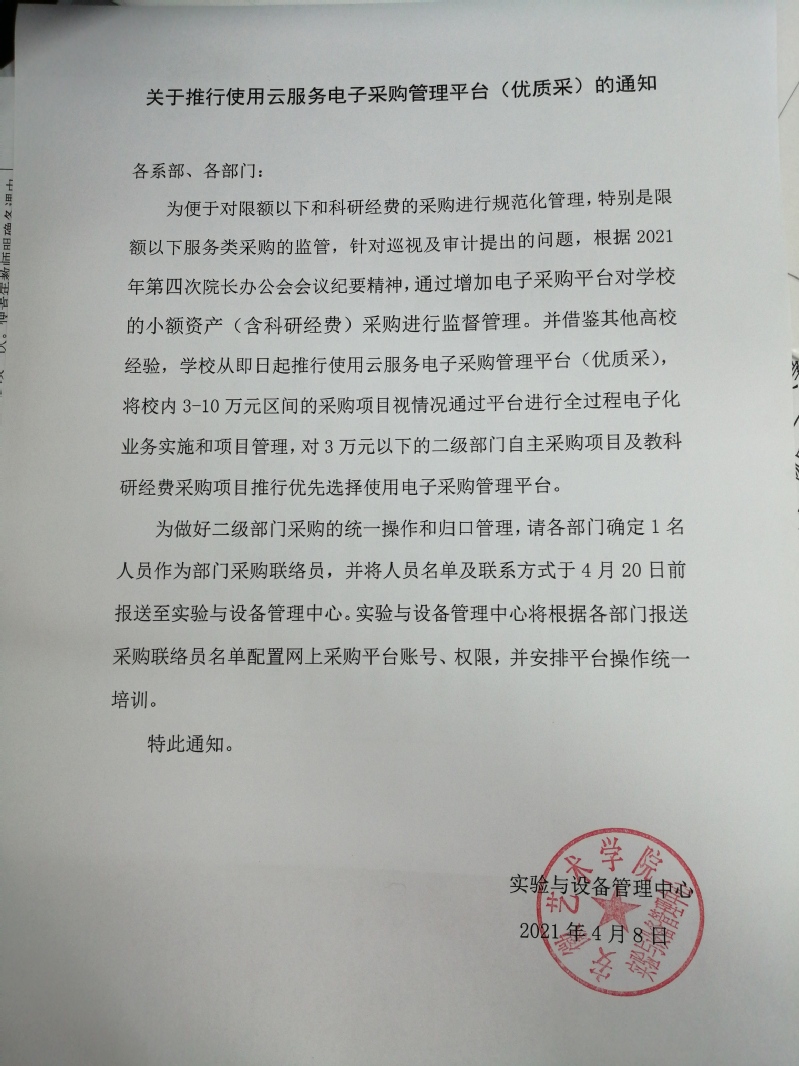 关于推行使用云服务电子采购管理平台(优质采)的通知