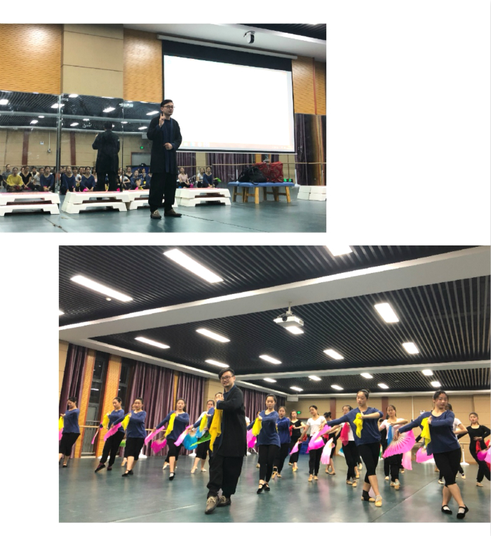 在实践教学体验环节,孙超分别为大家展示了冯派、陈派、郑派、杨派等十几个流派的花鼓灯舞蹈。孙老师的舞蹈动作刚健朴实、欢快热烈,富有浓郁的乡土气息,让同学们充分感受到这曾被周总理誉为“东方芭蕾”、又有“淮畔幽兰”美称的安徽花鼓灯的魅力。