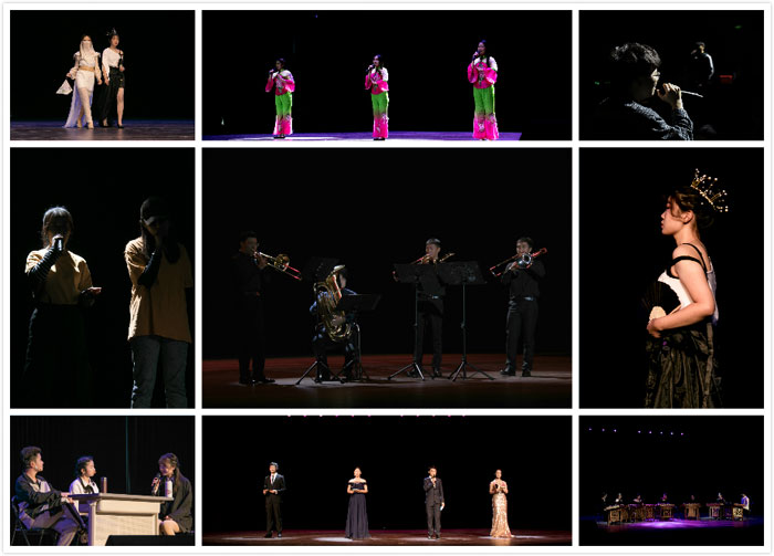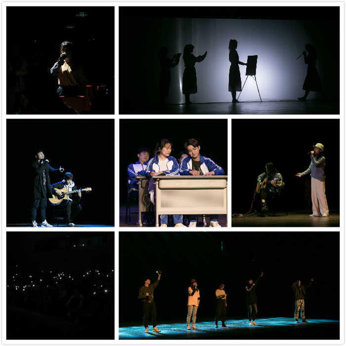 晚会由激情洋溢的安徽民歌联唱开幕,一开始就点燃了全场的气氛。管乐合奏、小品、现代舞串烧、Rap、歌曲演唱、T台秀……形式多样的节目精彩纷呈,让同学们热情澎湃。其中,创意节目光影秀《流年》由美术设计系19级(4)班全体学生表演。他们巧妙利用光和影,在黑白剪影中讲述生动的新生大学故事,引起观众们强烈的共鸣,掌声阵阵。