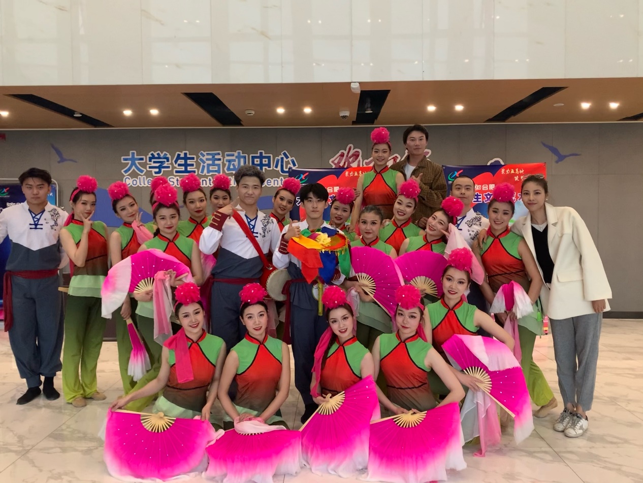 2020年11月21日下午,我院24位同学在合肥职业技术学院汇心湖校区参加了由中共合肥市委宣传部、共青团合肥市委员会主办,消遣文化传媒承办的2020“聚力五高地 筑梦新时代”合肥大学生文化艺术季校园舞蹈大赛的决赛。最终我院原创作品安徽花鼓灯舞蹈《花鼓情》荣获了中国舞组总成绩第一名的好成绩。