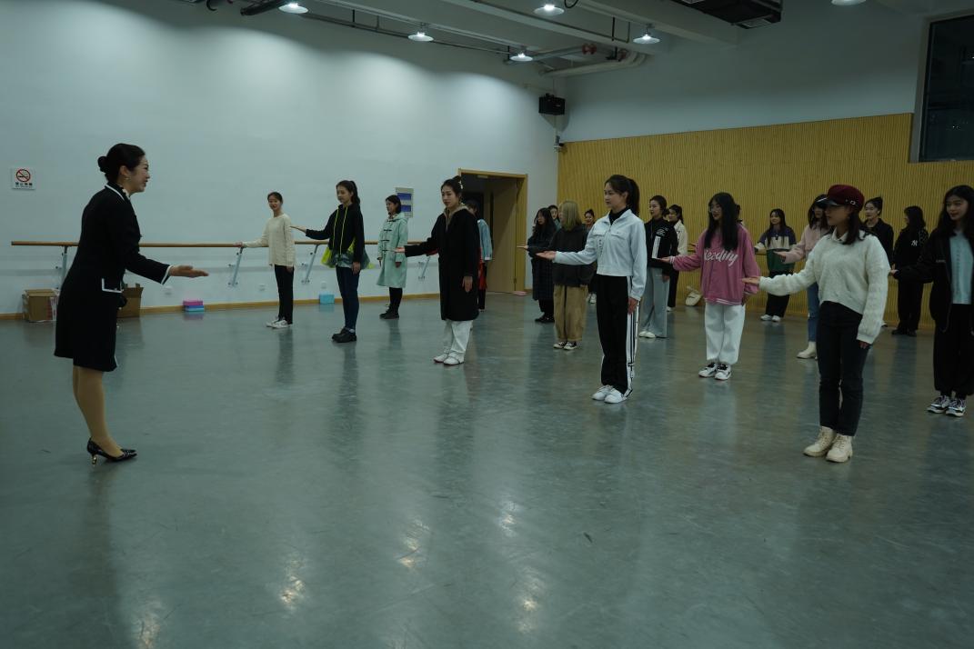 为备战世界制造业大会开幕式暨文艺演出,做好活动现场的礼仪服务工作,11月17日下午,学校礼仪社邀请专业礼仪培训师吴佳佳在舞蹈楼现场教学。