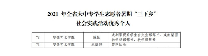 我校学生陈歆和池威恺荣获2021 年度全省大中专学生志愿者暑期“三下乡”社会实践活动“优秀个人”称号。