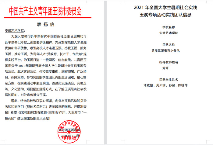 共青团玉溪市委员会向我校发来表扬信,对我校在由共青团中央举办的“2021年全国大学生暑期社会实践玉溪专项活动”中的优异表现予以高度赞扬。表扬信说,“此次实践活动,你校高度重视,周密部署,广泛动员,保障支持。参与实践的学生团队克服生活困难,精心制定方案,在实践活动中表现突出。”(撰稿/供图:程文 初核:龙源 编辑:朱新水 审定:张雷雷)