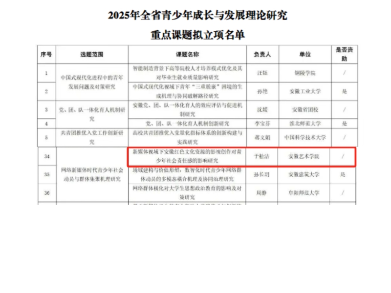 近日,2025年全省青少年成长与发展理论研究重点课题立项名单公布,我校戏剧学院教师于松洁申报的课题《新媒体视域下安徽红色文化资源的影视创作对青少年社会责任感的影响研究》喜获立项,这是我校首次获批立项共青团省级重点项目。