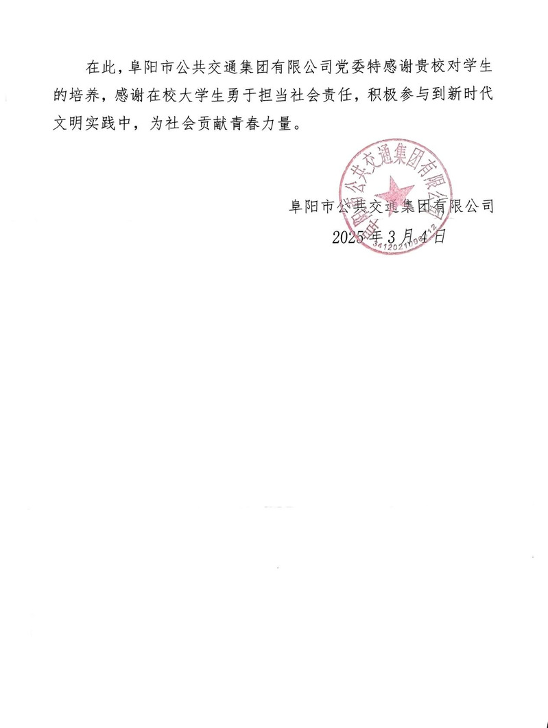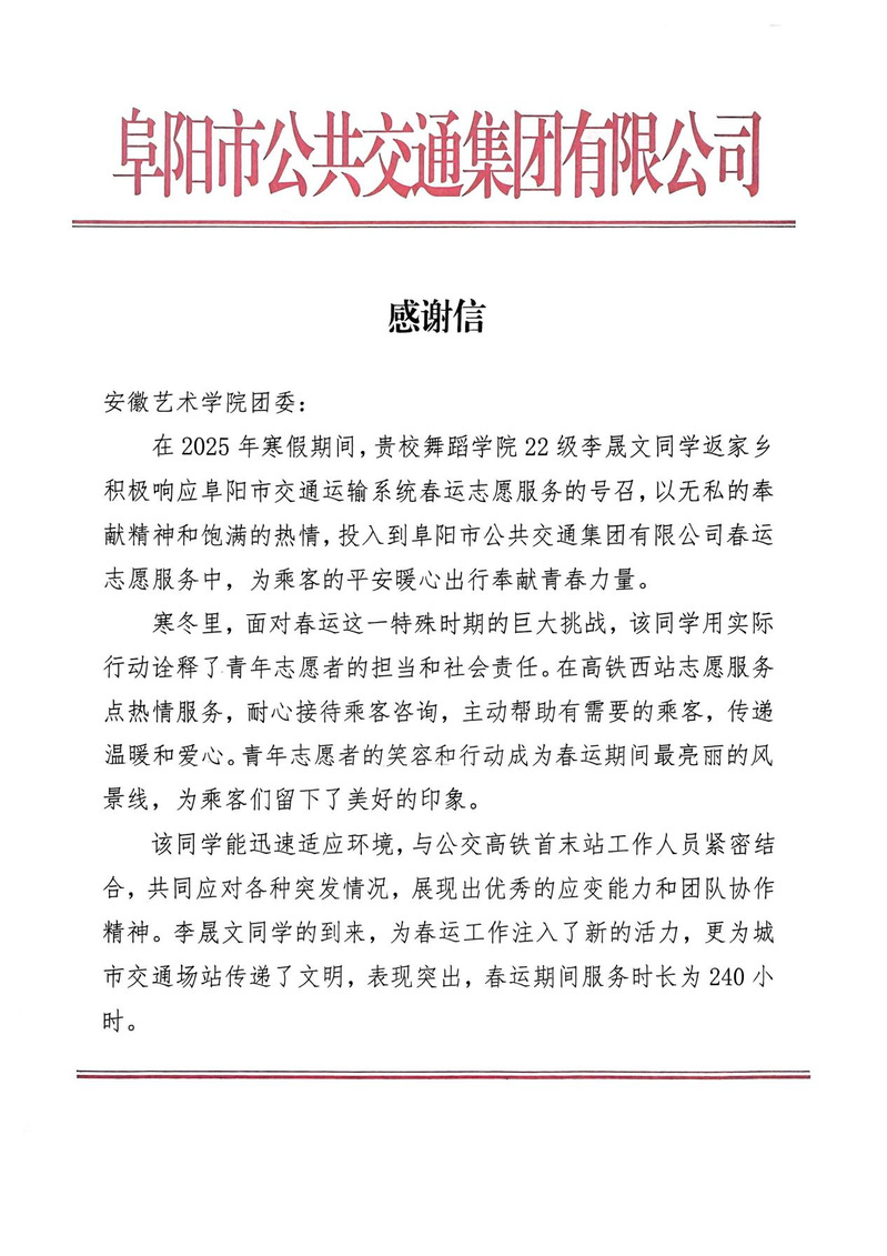近日,安徽艺术学院收到了一封来自阜阳市公共交通集团有限公司的感谢信,对学校舞蹈学院2022级李晟文同学在2025年寒假期间积极参与春运志愿服务表示由衷的感谢和高度赞扬。