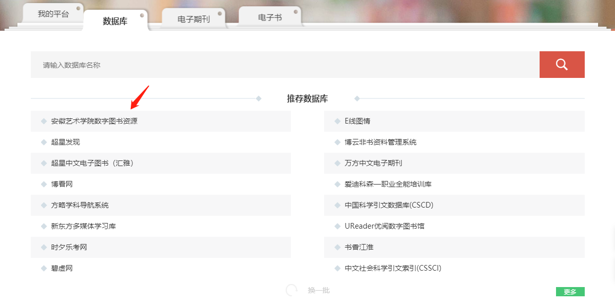 1、打开学院官网,点击右侧状态栏“数字资源”,选择“安艺数字资源管理平台(校外访问数字资源)”,登录后再选择“数据库”-“安徽艺术学院数字图书资源”进行使用。账号为一卡通卡号,密码为身份证后六位。
