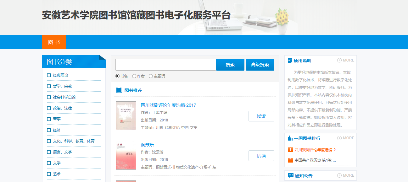 为了提高馆藏新书的利用率和保障能力,图书信息中心积极开展并完成了馆藏新书数字化项目,除个别特殊开本图书外,基本实现当年新购纸本图书的全品种覆盖,每一种新购纸本图书均配备相应的数字图书。纸电配合,共同保障读者的阅读需求,且数字化新书可供多人同时阅读使用。目前,安徽艺术学院馆藏数字化借阅服务平台已正式启用。
