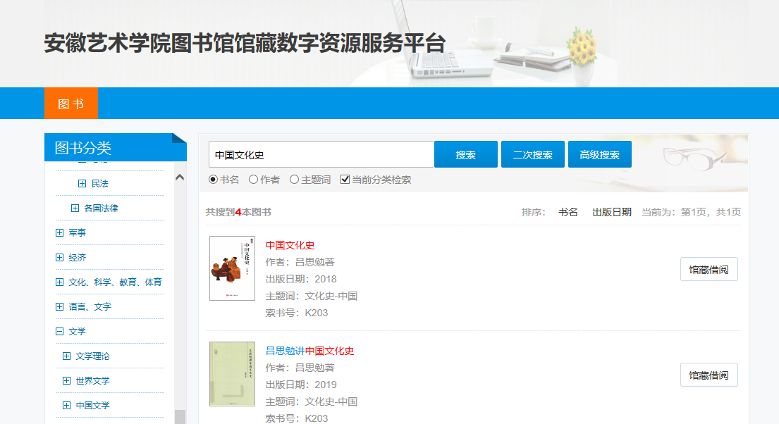 2、高级搜索:点击搜索框旁的“高级搜索”按钮,以书名、作者、主题词、出版日期等同时作为条件筛选结果。