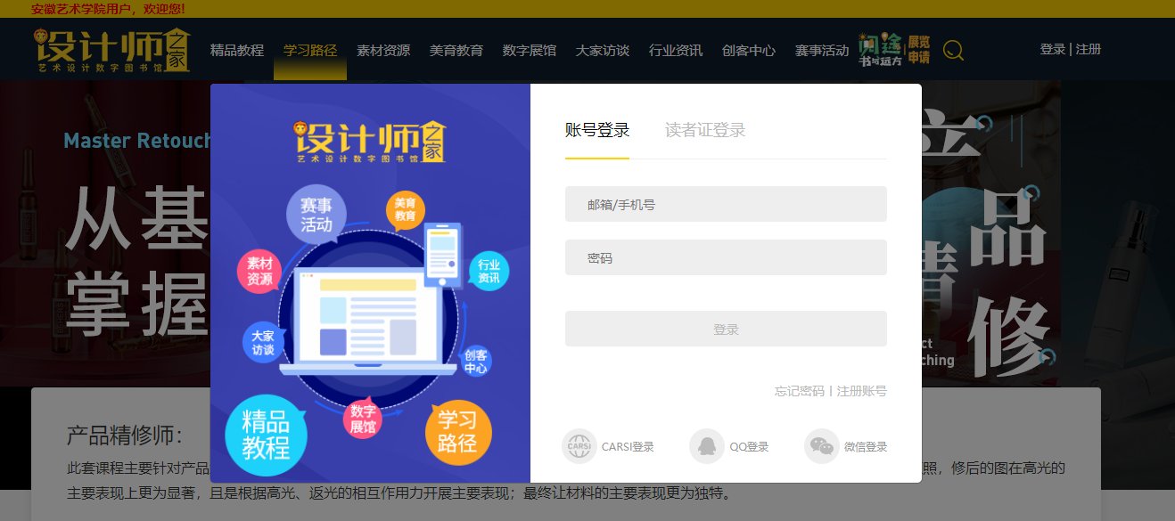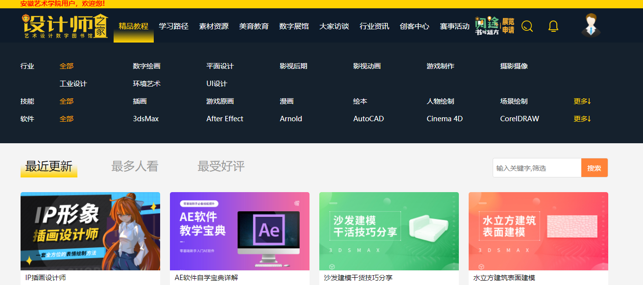 在学校ip范围内打开网址https://www.51sjsj.com,当左上角显示“安徽艺术学院用户,欢迎您”即可访问学习。