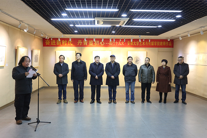 12月14日下午15点,由安徽大学艺术与传媒学院和安徽省文化馆联合主办的“奋进新时代、丹心鉴初心、践行十九大精神”美术设计系教师作品展在安徽画廊隆重开幕。安徽省文学艺术界联合会主席吴雪,安徽大学艺术与传媒学院党委书记、院长周之虎,党委副书记沈端良,副院长张晶,安徽省文化馆副馆长陈果,安徽省美术家协会理论委员会副主任王永敬,安徽省美术家协会壁画艺委会主任李鹏,安徽省美术家协会巾帼画会秘书长陶莉,皖宝斋乐四文化传播有限公司董事长吴乐四,学院相关部门负责人出席了开幕式。