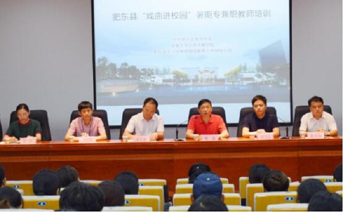 7月30日下午,由中共肥东县委宣传部主办、安徽大学艺术与传媒学院承办的肥东县“戏曲进校园”2018年第四期暑期教师集中培训开班仪式在我院美术楼学术报告厅举行。来自肥东县近50所中小学学校及肥东县教体局、肥东县教师进修学校近百名教师学员参加了本次开班仪式。