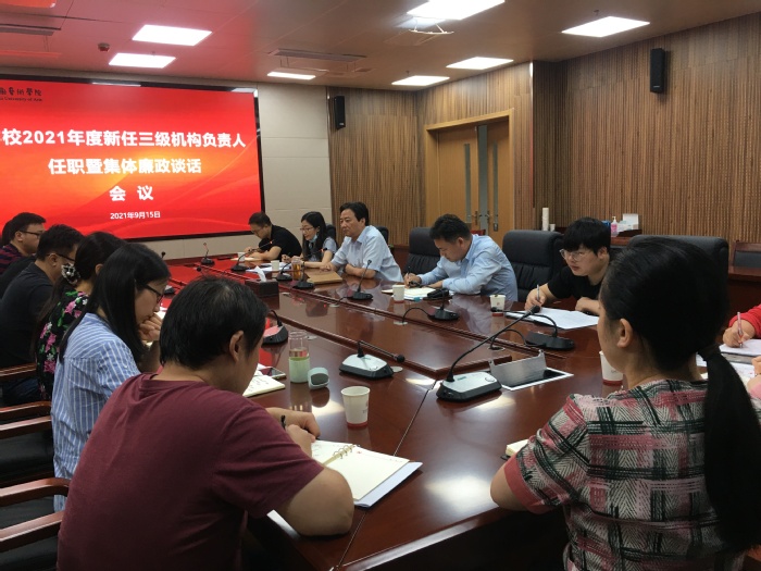 9月15日下午,学校在综合楼823会议室召开2021年度新任三级机构负责人任职暨廉政谈话会议。校纪委书记、监察专员宣扬,校党委委员、组织部部长曹晓富出席会议,新任职的10名三级机构负责人和纪委办全体人员参会。会议由纪委办公室副主任丁永红主持。