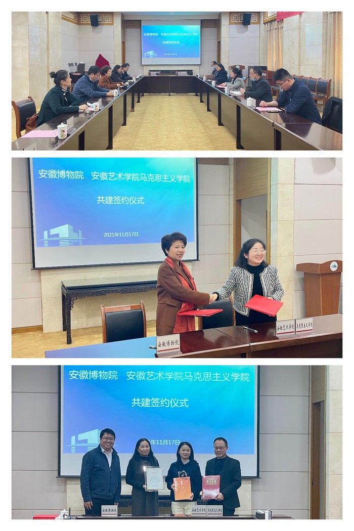 陈昀岚、徐大珍先后发表热情洋溢的讲话,代表双方单位在《安徽艺术学院马克思主义学院与安徽博物院共建“思想政治理论课实践教育基地”协议书》上签字,并共同为安徽艺术学院学院马克思主义学院“思想政治理论课实践教育基地”揭牌。