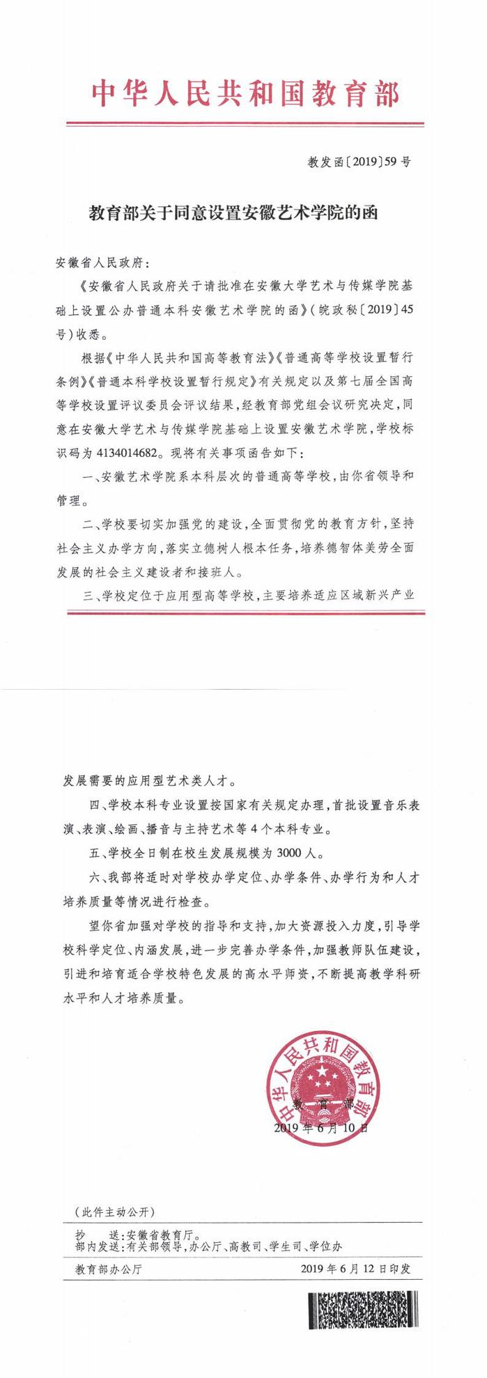 2012年8月,省委省政府决定恢复组建本科层次的安徽艺术学院,并列为文化强省建设重点工程。2013年12月省政府批复同意依托安徽大学,成立安徽大学艺术与传媒学院,由省教育厅主管,纳入省属普通本科院校序列管理。从“十二五”到“十三五”,省委省政府历任领导对筹建安徽艺术学院工作给予高度重视,要求高起点规划、高标准设计、高质量建设,建成具有安徽地方特色、专业优势明显、特色学科国内一流的艺术类本科院校。2014年1月,安徽大学艺术与传媒学院党委成立,同年7月,第一届学生进校。经过五年多的艰辛努力,2019年6月10日,教育部致函安徽省人民政府,同意在安徽大学艺术与传媒学院的基础上设置安徽艺术学院。11月2日省政府下达《关于设置安徽艺术学院有关事项的通知》。12月28日,安徽艺术学院正式挂牌成立。
