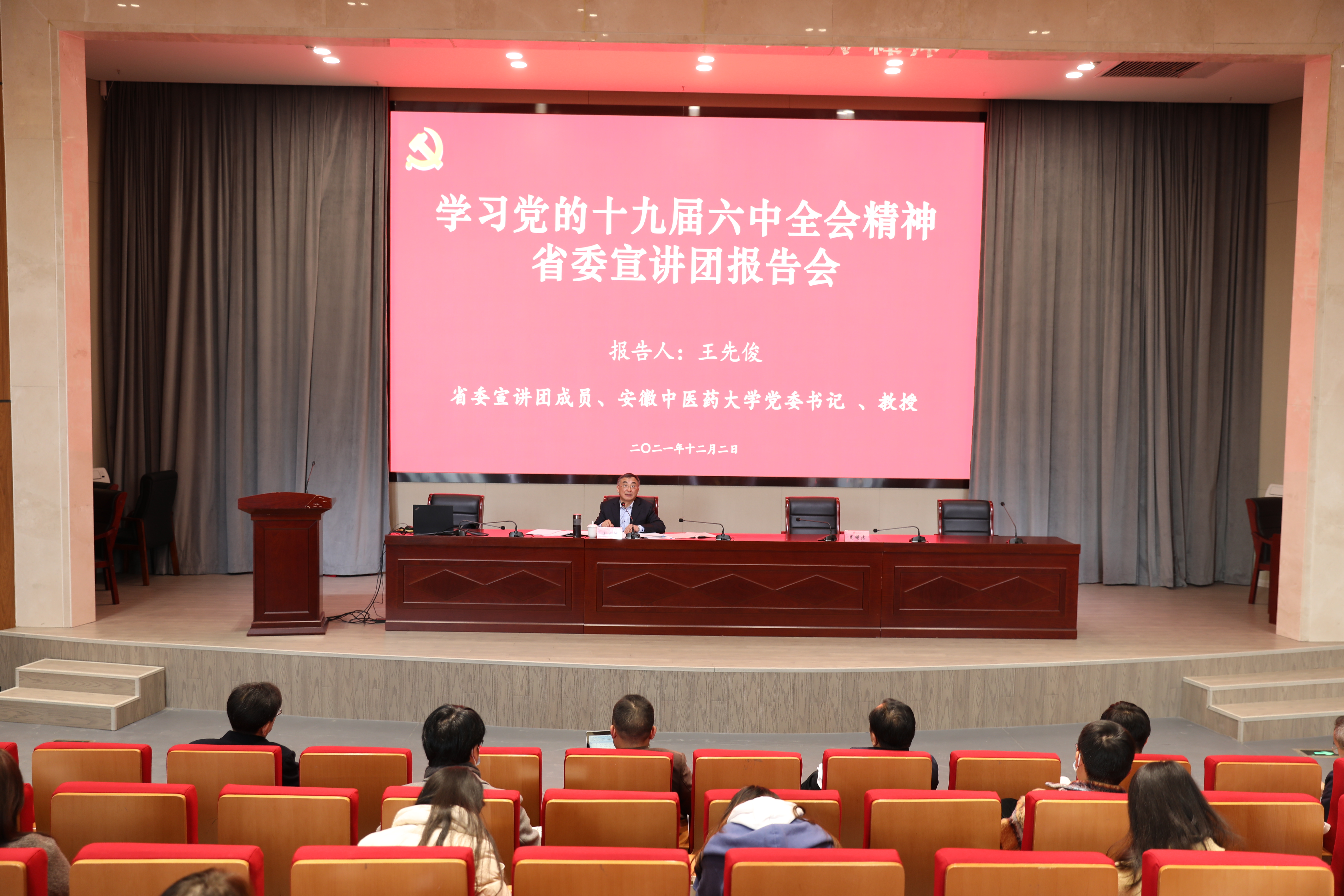 根据学校统一部署,12月3日下午,学习党的十九届六中全会精神宣讲报告会暨安徽艺术学院社科联2021年学术年会在综合楼五楼学术报告厅举行。省委宣讲团成员、安徽中医药大学党委书记、教授王先俊受邀宣讲。报告会由校党委书记周明洁主持。