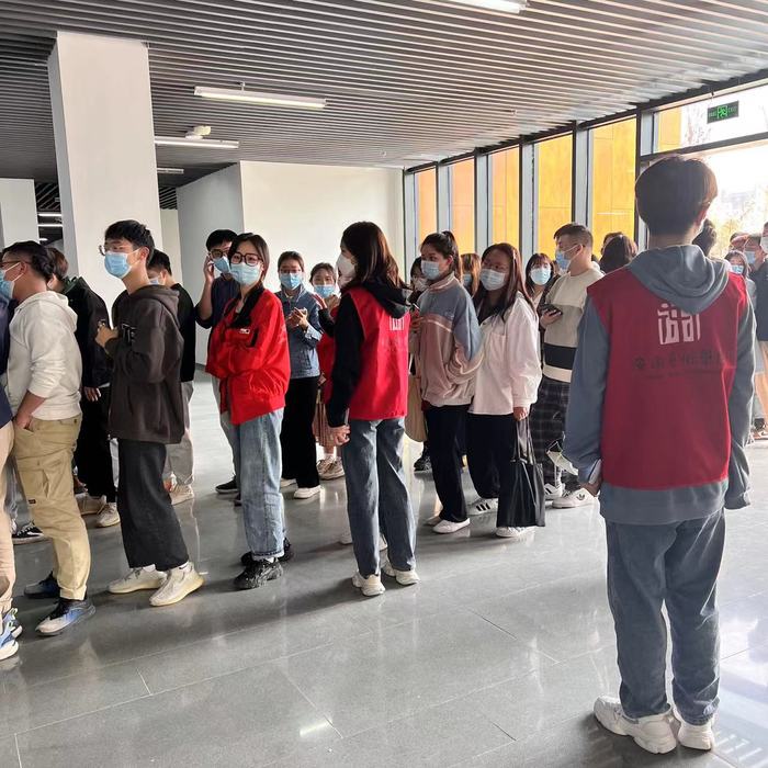 “请大家戴好口罩,保持一米的安全距离。”“请提前打开安康码,按秩序排队。”“扫完码的同学,请从前方排队。”15日下午,新闻播音系全体师生分时段、分批次,陆续进入播音楼1楼检测区域。志愿者们也分时段、分组从13点工作到17点,整个现场井然有序。