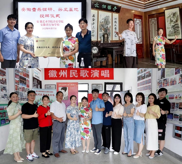 17日下午,调研组专程来到位于歙县的安徽省行知中学进行实地考察,行知中学党总支副书记、副校长曹雄威与操明花一同接受“安徽音乐调研、采风基地”的授牌。调研组实地参观行知学校非遗实践教学场所、教学成果及大师工作室等。徽州民歌国家级传承人操明花,市级传承人方有土、唐萍等演唱十余首特色鲜明的徽州民歌,调研组现场采录并进行乐谱资料的收集与整理。