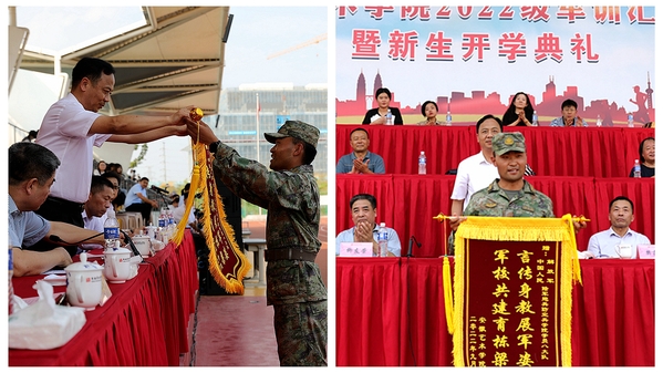 党委书记周明洁向承训部队陆军炮兵防空兵学院赠送锦旗。