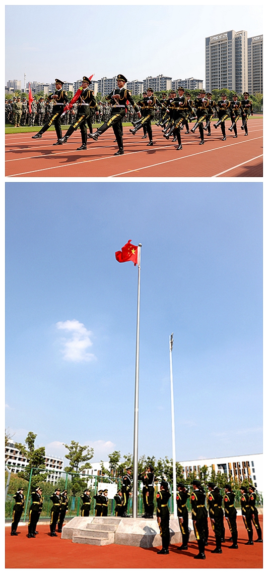 校行政负责人程世锁主持军训成果汇报。随着一声令响,国旗护卫队队员迈着整齐划一的步伐,昂首挺胸、英姿飒爽地正步走向升旗台。鲜艳的五星红旗冉冉升起,全体师生面向国旗庄严肃立。在旗手带领下,全体10支连队方阵依次入场,姿态整齐、口号嘹亮。各连队方阵以齐步与正步交替踏出,分列主席台正前方。