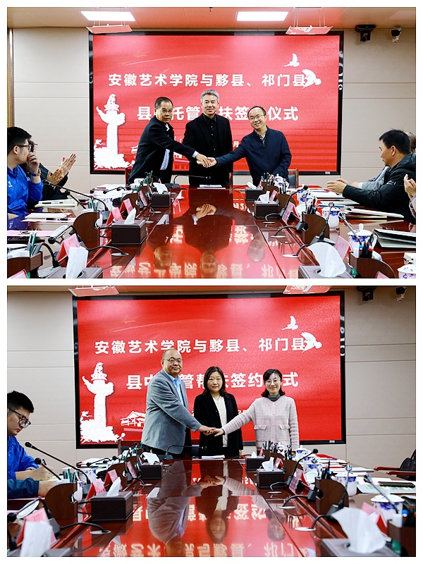 孙来法代表校方与吕海江、祁门县第一中学校长张进球签订安徽艺术学院、祁门县人民政府、祁门县第一中学三方托管帮扶协议。美术学院副院长李李代表校方与金鑫、黟县中学校长朱守伟签订安徽艺术学院、黟县人民政府和黟县中学三方托管帮扶协议。