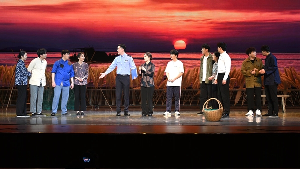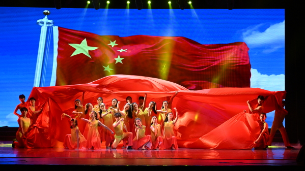整个艺术党课的课堂上,舞台、讲台融为一体,剧本、课本相辅相成,处处是艺术的浸润。发间、手腕缠绕的一条条红丝带,在轻盈的腾空和坚定的挥扬里汇成壮阔的浪潮,外化心中火热的红;在对大包干带头人严俊昌一家三代的访谈记录和参与访谈师生的现场对话里,课前实践调研与课堂提问交流相呼应;rap搭配Hiphop,满满的青春动感,唱出创新之城的活力勃发;薛家洼的芦苇荡和渔网也搬上了舞台,紧凑的矛盾冲突中讲述“三姑娘”上岸的故事;朗诵中一个个枝叶关情的暖心场景,“点点水珠聚成澎湃之势”,引出尾声《领航》,红旗漫卷、歌声高昂,余味悠长……