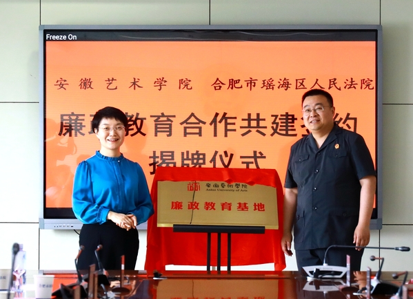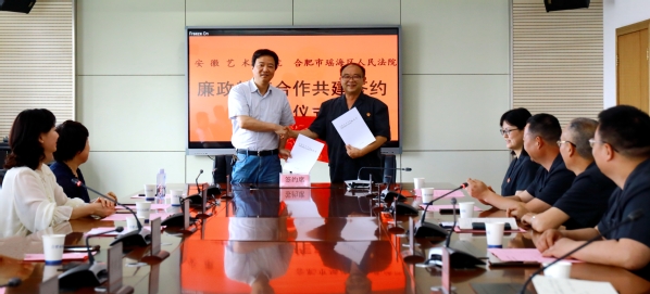 6月1日下午,学校与合肥市瑶海区人民法院廉政教育合作共建签约仪式在瑶海区人民法院9楼会议室举行。党委书记韩军与瑶海区人民法院党组书记、院长凌岩为安徽艺术学院廉政教育基地揭牌。党委委员、纪委书记、监察专员宣扬与瑶海区人民法院党组副书记、副院长朱加强签订廉政教育合作共建协议。党委委员、人事处处长、戏剧学院党总支书记曹晓富,党委委员、宣传(统战)部部长王琍琍参加。