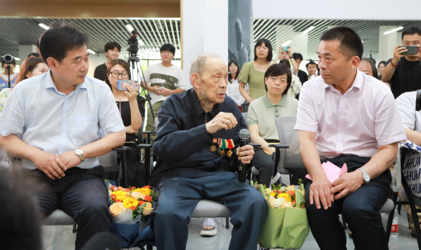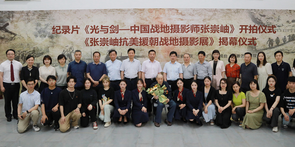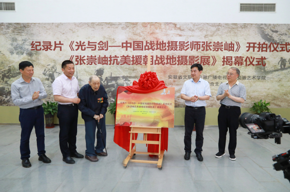 随后,张崇岫和陈先发、邵晓辉、樊嘉禄一同为纪录片《光与剑——中国战地摄影师张崇岫》开拍仪式和《张崇岫抗美援朝战地摄影展》揭幕。