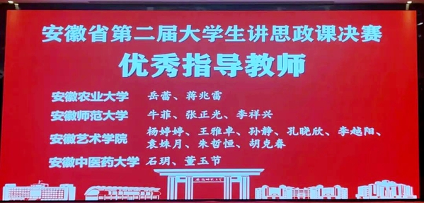 本次比赛以“新思想引领新征程 新青年建功新时代”为主题,分为初赛、片区赛和决赛三个阶段。自6月底正式启动以来,学校相关职能部门和各二级学院积极响应,马克思主义学院设立双指导教师团队跟进指导,从选题、教案、讲稿、课件等方面积极备赛。最终,从皖中片区赛晋级决赛的4组团队中,张安然团队《井冈红旗展如画——中国新民主主义革命道路的提出》(指导老师:朱哲恒、胡克春)获特等奖,叶安琪团队《弘扬伟大抗战精神 做新时代的爱国者》(指导老师:李越阳、袁姝月)、宋天宇团队《弘扬中国精神 凝聚中华力量》(指导老师:孙静、孔晓欣)、刘洁团队《全面推进乡村振兴——从小岗人的小岗梦说起》(指导老师:杨婷婷、王雅卓)分别获二等奖。朱哲恒、胡克春、李越阳、袁姝月、孙静、孔晓欣、杨婷婷、王雅卓获评优秀指导教师。