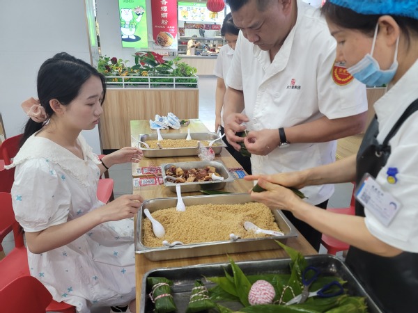 过程中不乏趣味插曲:新手们因粽叶折叠不当导致“露馅事故”;有人别出心裁地用粽叶编出小船造型,赢得喝彩。短短两小时,形态各异的粽子铺满操作台,既有传统四角粽的稳重大方,也有“迷你粽”“卡通粽”的创新巧思,成为传统文化与青春创意碰撞的生动注脚。