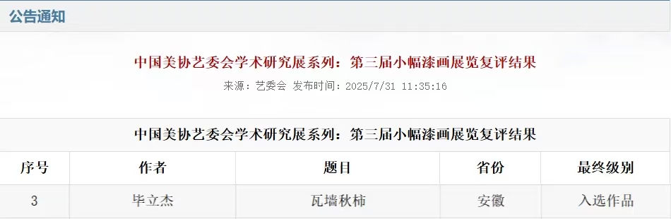 近日,中国美术家协会艺术委员会学术研究展系列:“第三届全国小幅漆画展”复评结果公布,设计学院非物质文化遗产保护专业2022级学生毕立杰的漆画作品《瓦墙秋柿》成功入选。作品由我院青年教师邱俊杰指导。