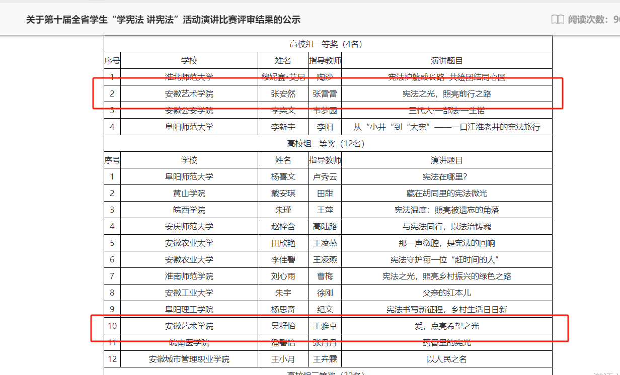 近日,由安徽省教育厅组织开展的第十届全省学生“学宪法 讲宪法” 活动演讲比赛评审结果公示,我校选送的张安然和吴籽怡两位同学分别获得一等奖和二等奖,以优异成绩彰显了我校法治教育的扎实成果与学生的良好法治素养。